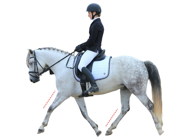 If the horse does not have enough strength and balance, it may tend to move inappropriately. The back may sag and the parallel line between the front and hind legs described above will be missing. The horse will eventually be challenged in its body because of inappropriate wear and tear on some structures in the body while others are used too little.